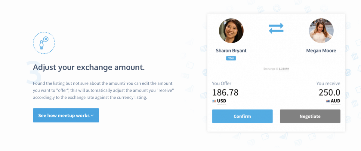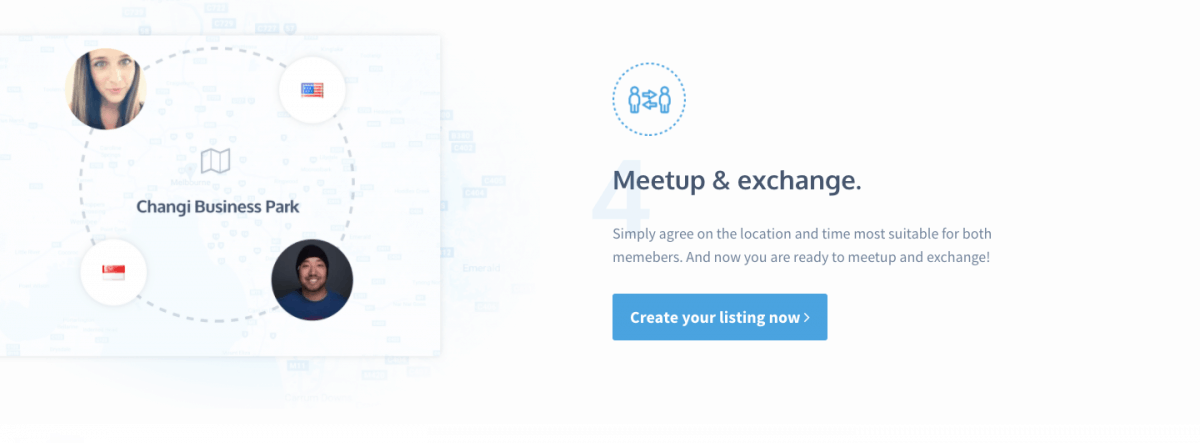 In a few simple steps, this platform allows us to discover people wanting the same currency that we are looking to sell. Think changing money without a money changer.
