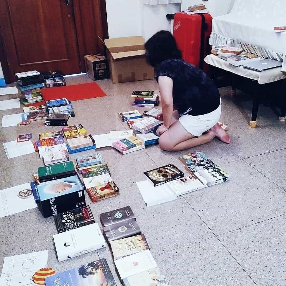 Crystal sorting out the preloved books they have collected. Source
