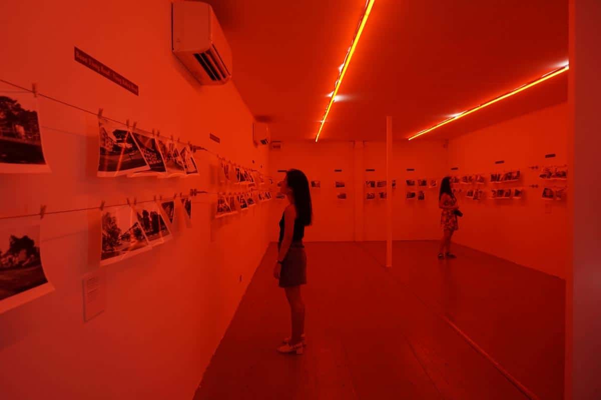 The gallery on the second floor is set in dim red light, with black and white photographs of old housing estates pegged to the strings on the wall. These are beautiful memories of Singapore’s housing landscape in the 50s and beyond, and showcase significant buildings and estates close to the people’s hearts.