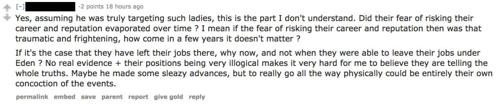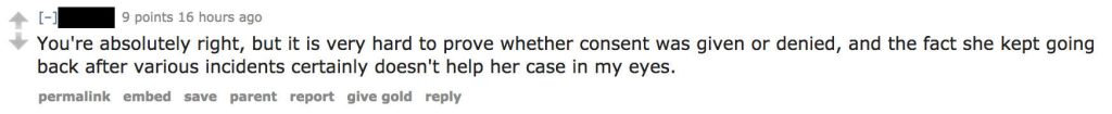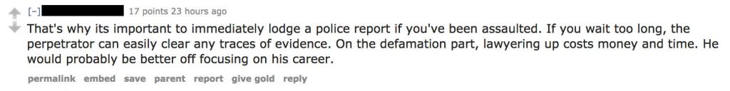 Quite literally the case of he said she said, most comments shaming the victims called into question the lack of evidence and the time elapsed between the crime and coming forward.