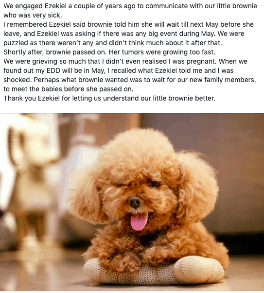 He recounted a recent incident in which a dying toy poodle told him that she will pass away only by May next year. Unfortunately, the toy poodle succumbed to her illness by next week, and Ezekiel was disheartened that his reading had been inaccurate.
