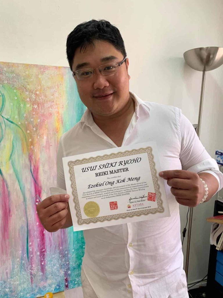 Ezekiel posing with one of his certificates in reiki healing. Source: Ezekiel Ong