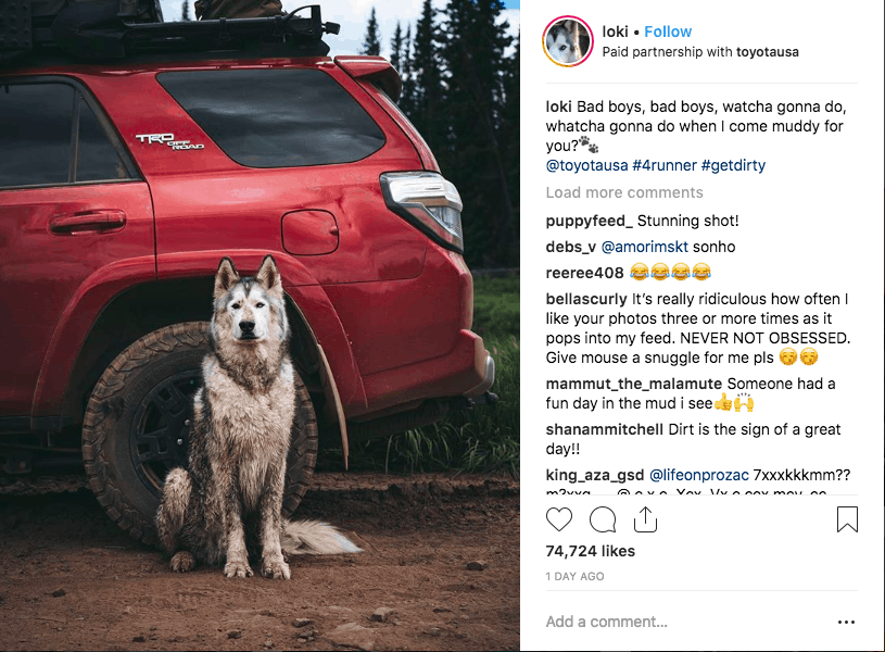 Loki the Wolfdog in a sponsored Instagram post for Toyota USA. Source