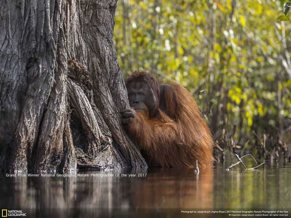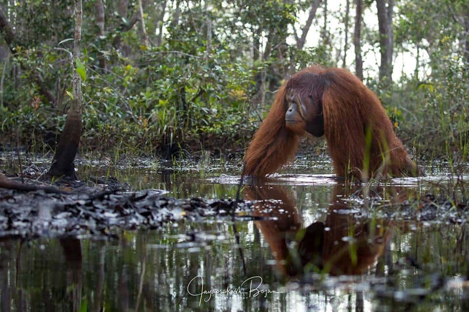 The photographer eventually captioned this shot: “Rampant palm oil cultivation threatens this critically endangered ape, forcing the normally arboreal species to resort to unusual behaviour – such as wading through crocodile-infested rivers – in order to survive.”